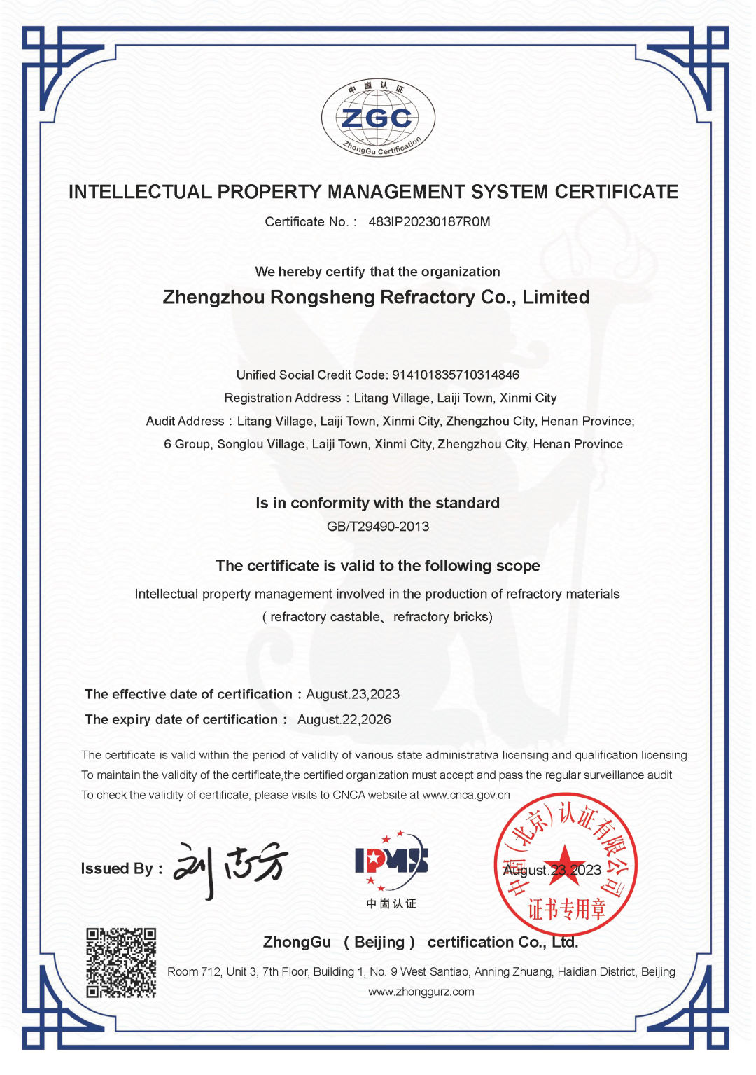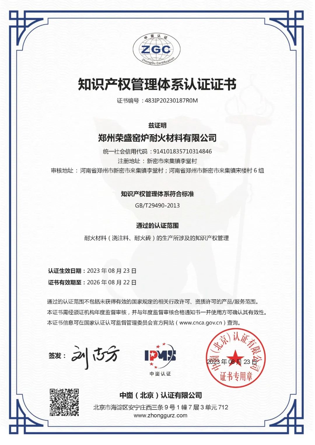 近日,鄭州榮盛窯爐耐火材料有限公司(以下簡稱「榮盛耐材」)順利通過國家知識產權貫標認證,并獲得了《知識產權管理體系認證證書》中英文雙語認證。該項認證的順利通過,標志著榮盛耐材構建了一套規范化、系統化、程序化、精細化的知識產權管理體系。